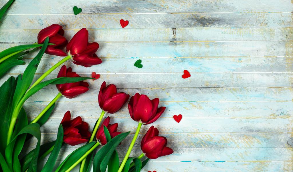 Обои Букет красных тюльпанов на деревянном столе