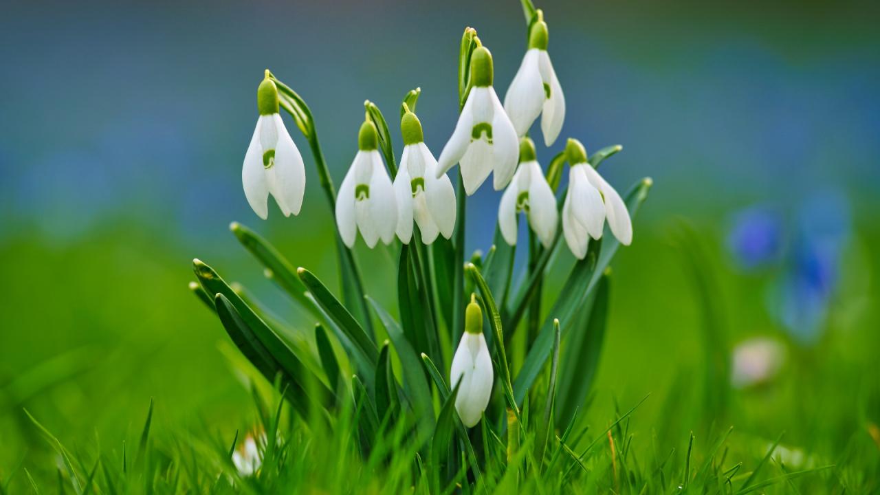 Обои Красивые белые весенние подснежники в зеленой траве