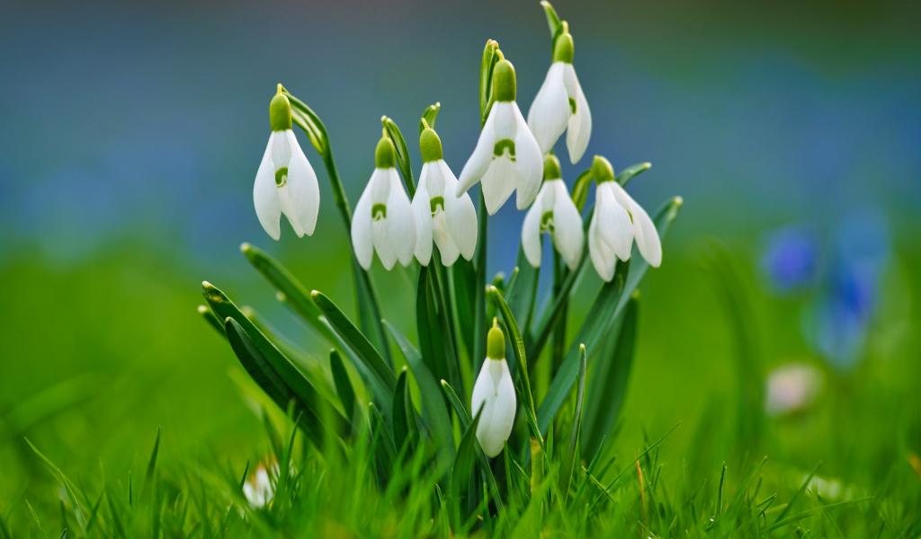 Обои Красивые белые весенние подснежники в зеленой траве