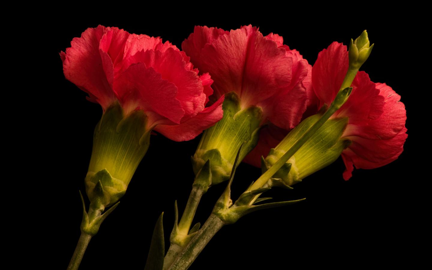 Обои Три крупные красные гвоздики на черном фоне
