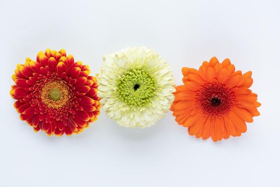 Обои Три разноцветные герберы на белом фоне