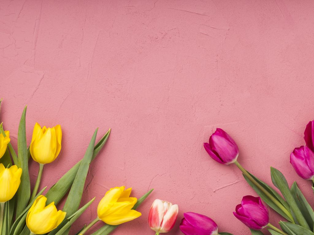 Обои Желтые и сиреневые тюльпаны на розовом фоне