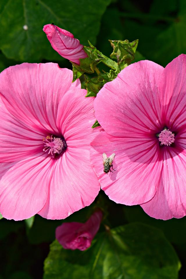 Обои Два розовых цветка мальвы с бутонами в саду
