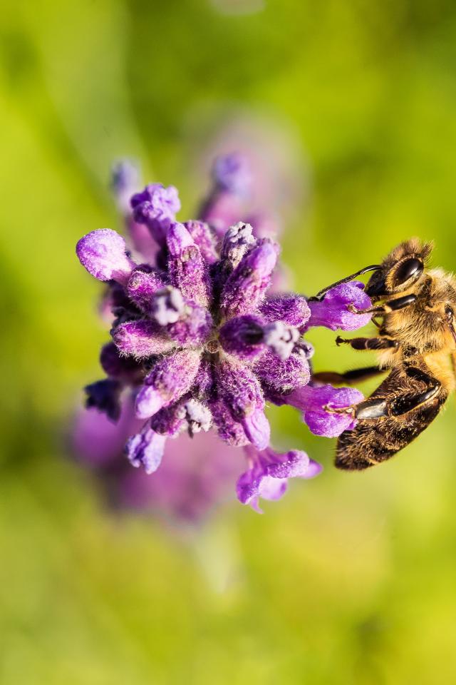 Обои Пчела собирает нектар на фиолетовом цветке