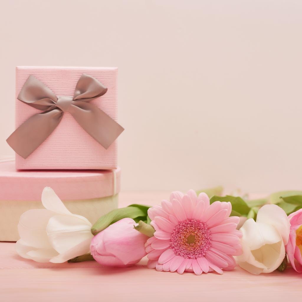 Обои Букет тюльпанов с герберой на столе с подарками