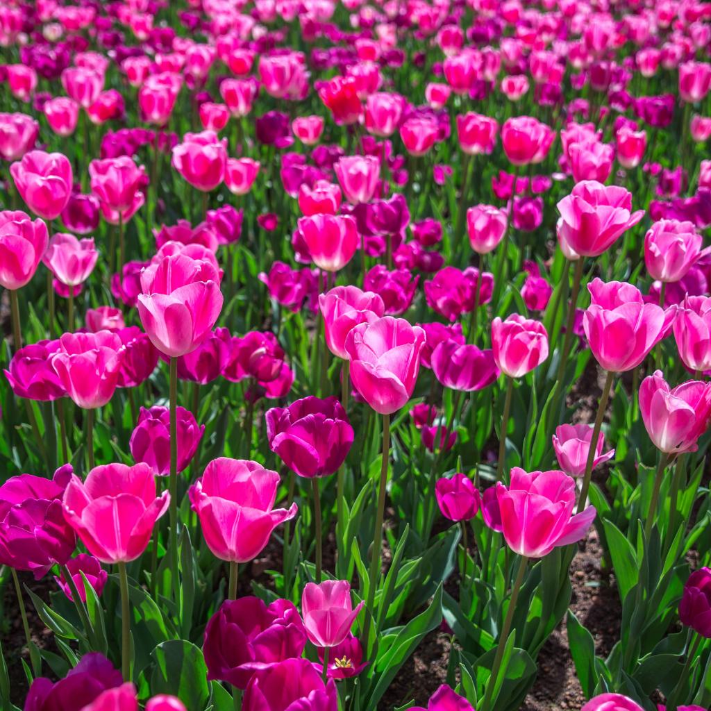 Обои Много красивых розовых тюльпанов на клумбе весной