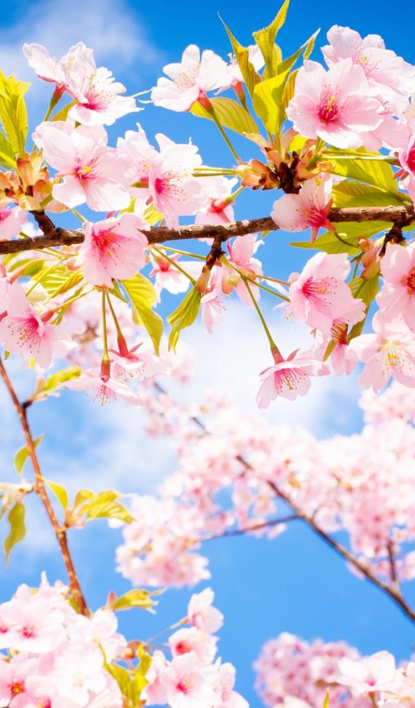 Обои Розовые цветы на ветке с зелеными листьями в лучах солнца