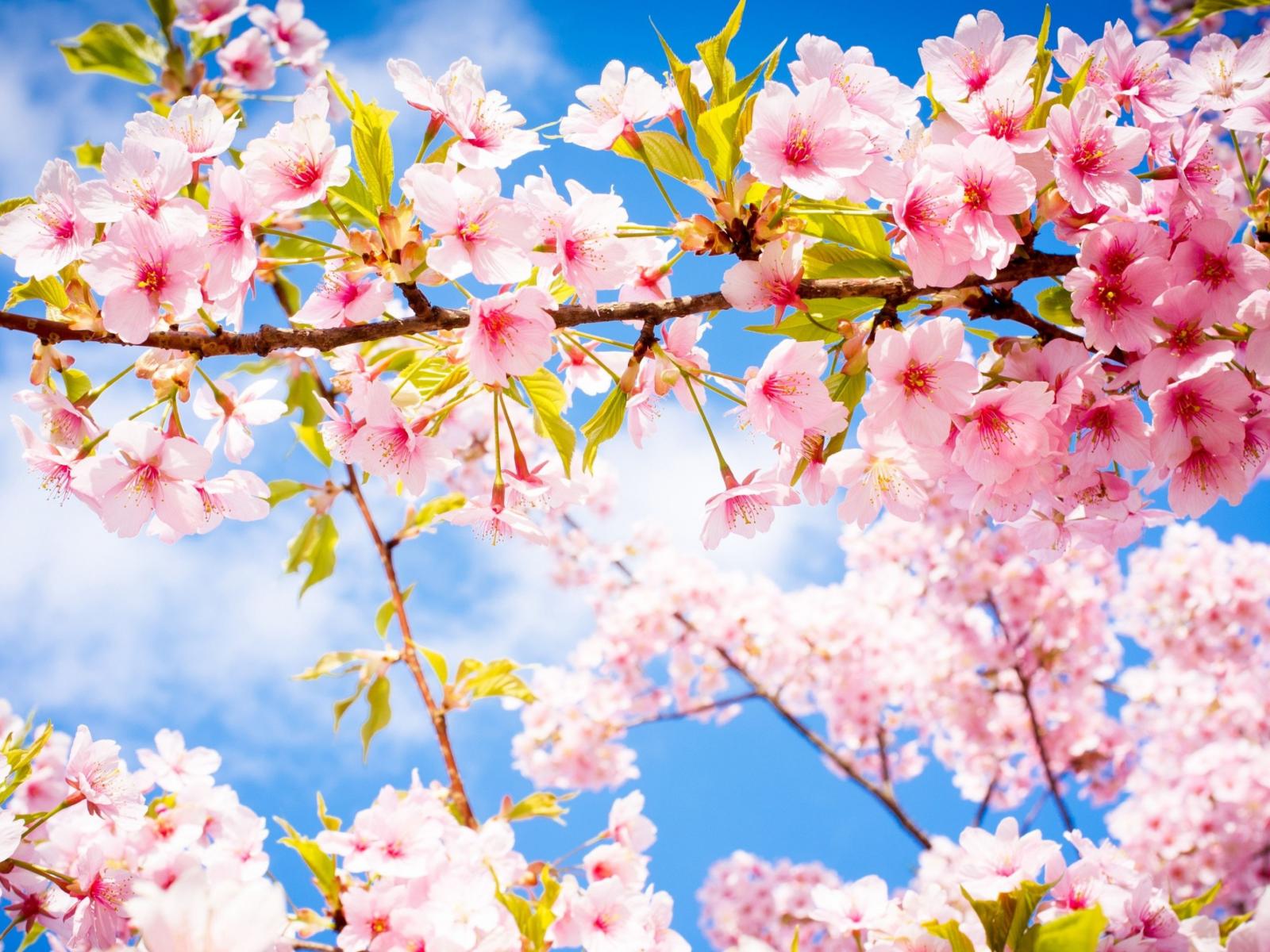 Обои Розовые цветы на ветке с зелеными листьями в лучах солнца
