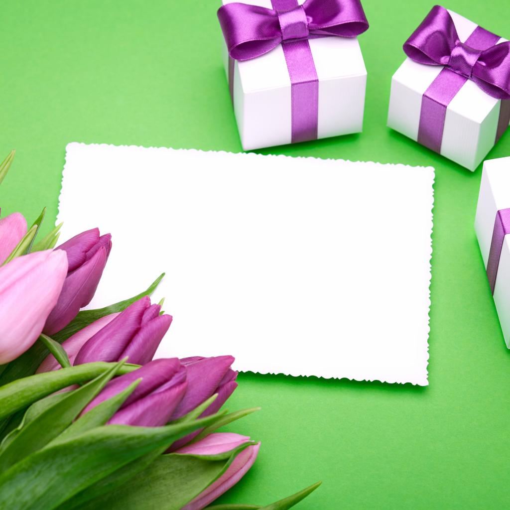 Обои Букет тюльпанов на столе с листом бумаги и подарками