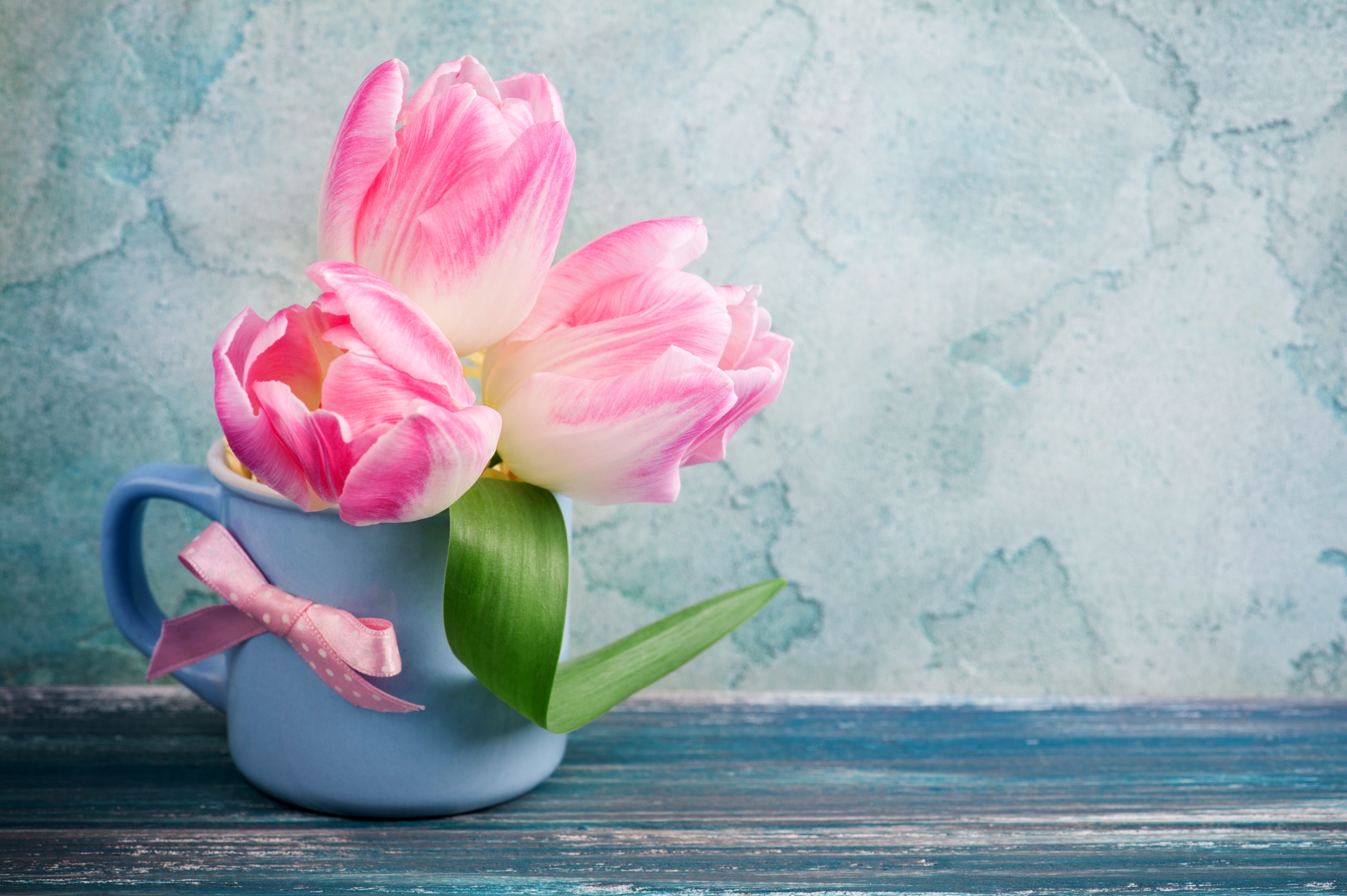 Обои Три розовых тюльпана в чашке на столе