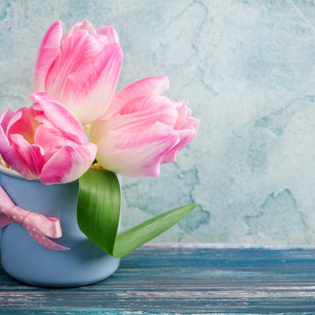 Обои Три розовых тюльпана в чашке на столе
