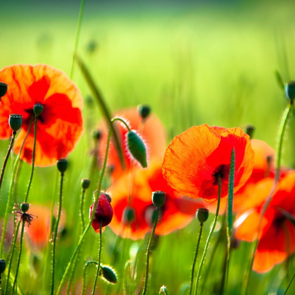 Обои Красные маки с бутонами на поле в лучах солнца