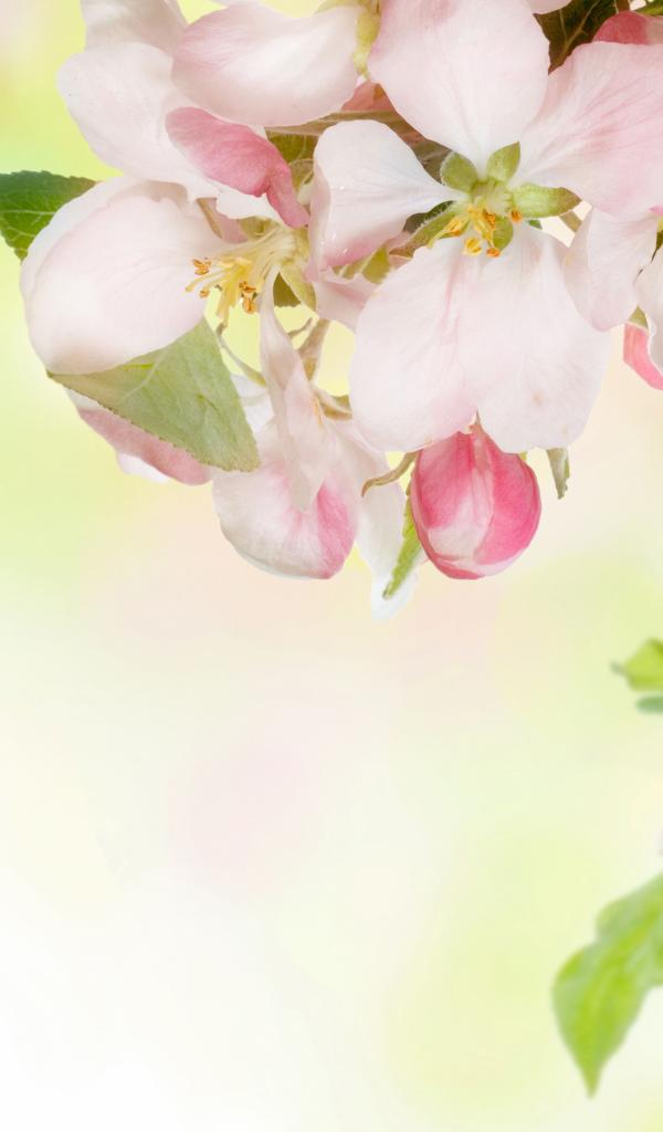 Обои Розовые цветы яблони на ветках с зелеными листьями