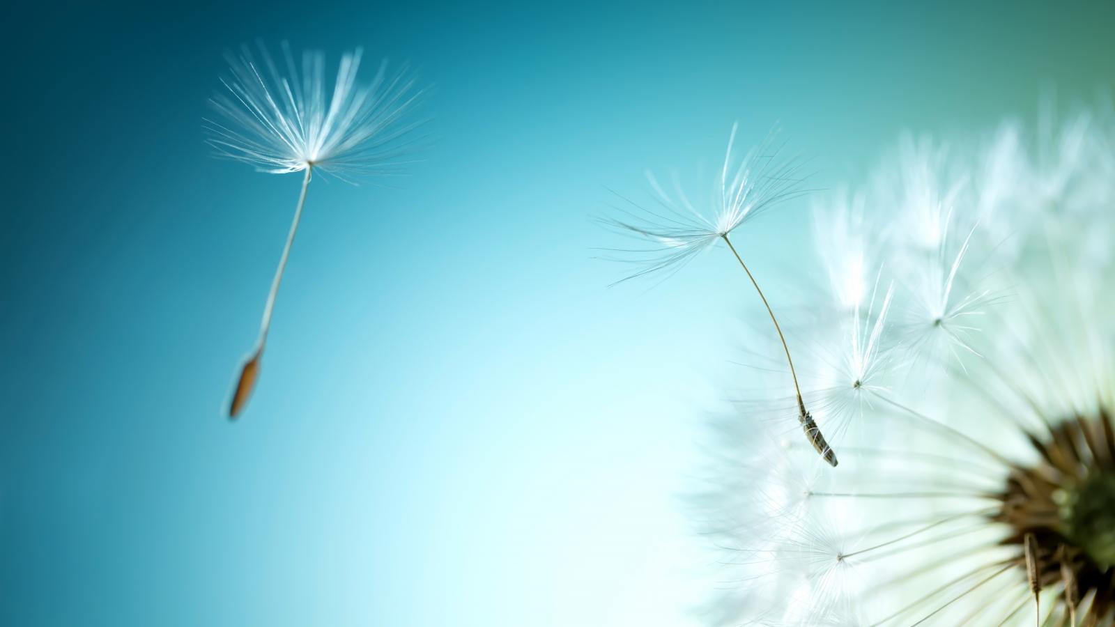 Обои Ветер раздувает белый одуванчик на голубом фоне