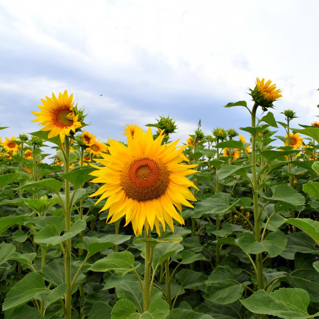 Обои Поле с высокими цветущими подсолнухами