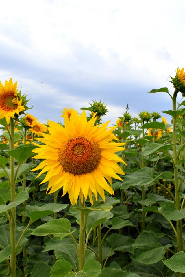 Обои Поле с высокими цветущими подсолнухами