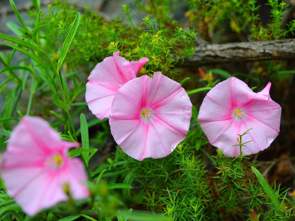 Обои Розовые полевые цветы в зеленой траве