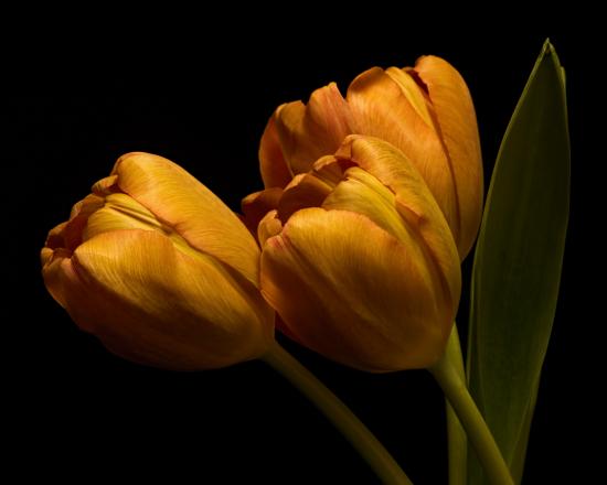 » Обои Три оранжевых тюльпана с зелеными листьями на черном фоне