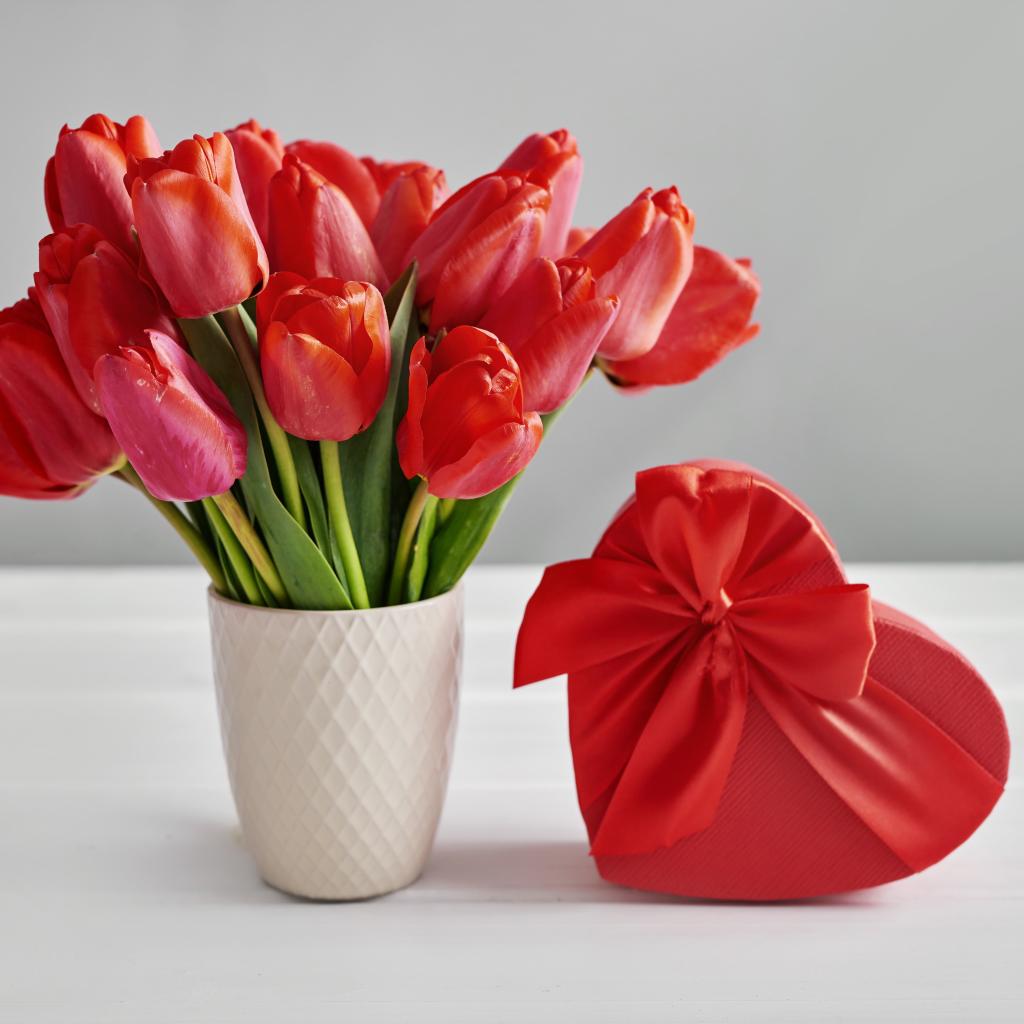 Обои Букет красных тюльпанов на столе с коробкой в форме сердца