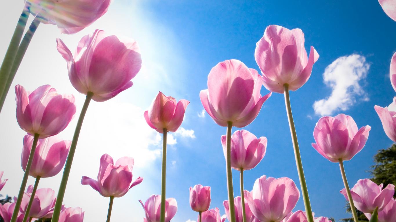 Обои Розовые цветы тюльпаны на фоне голубого неба