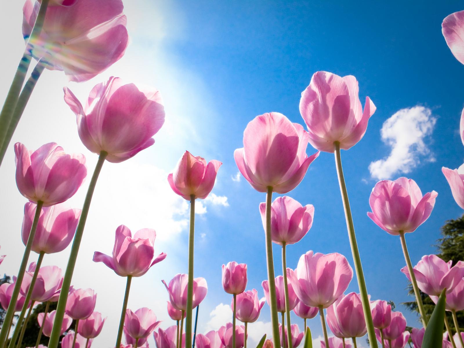 Обои Розовые цветы тюльпаны на фоне голубого неба