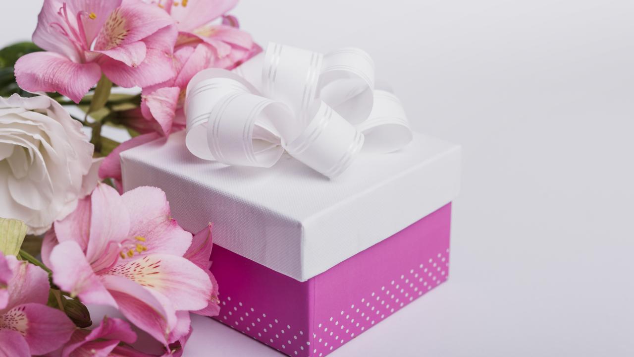 Обои Розовые цветы альстромерии на сером фоне с подарком