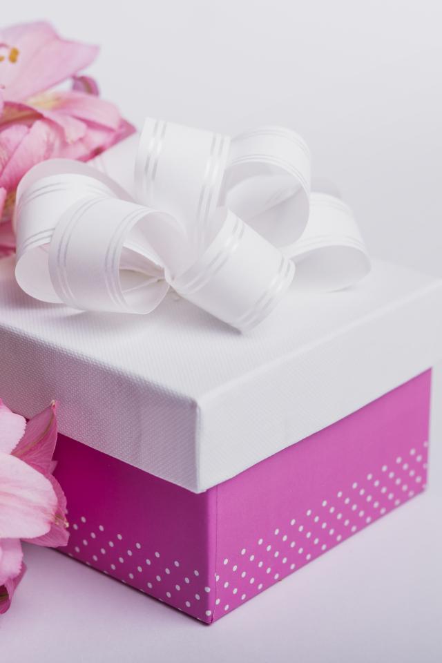Обои Розовые цветы альстромерии на сером фоне с подарком
