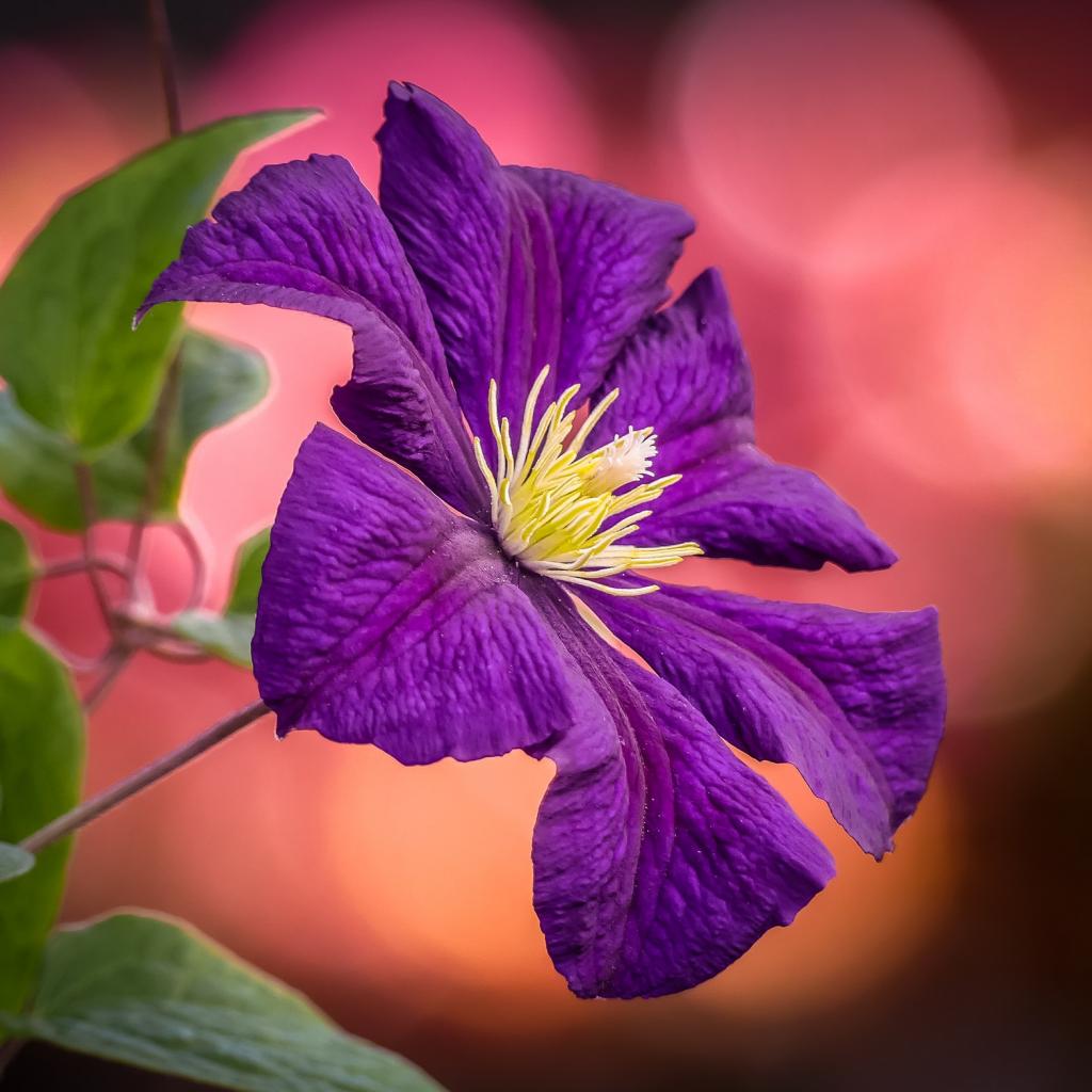 » Обои Фиолетовый цветок клематиса с зелеными листьями крупным планом