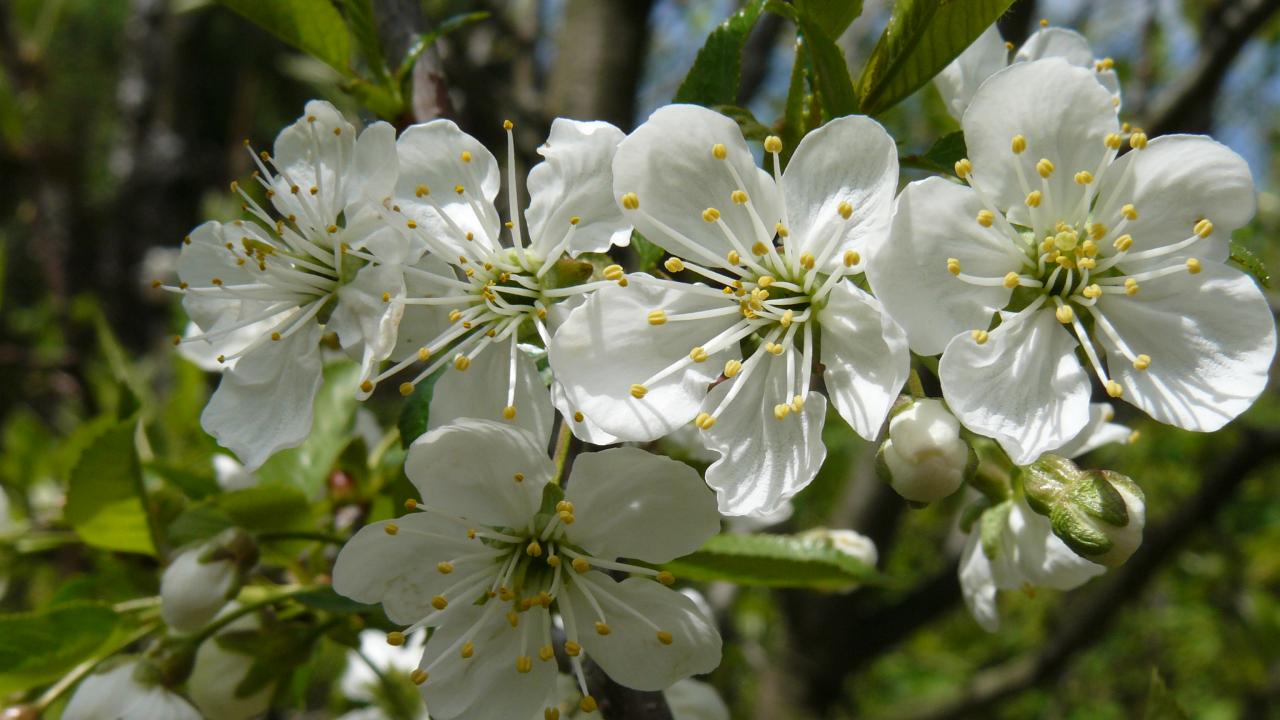 Обои Красивые крупные белые цветы черешни на ветке