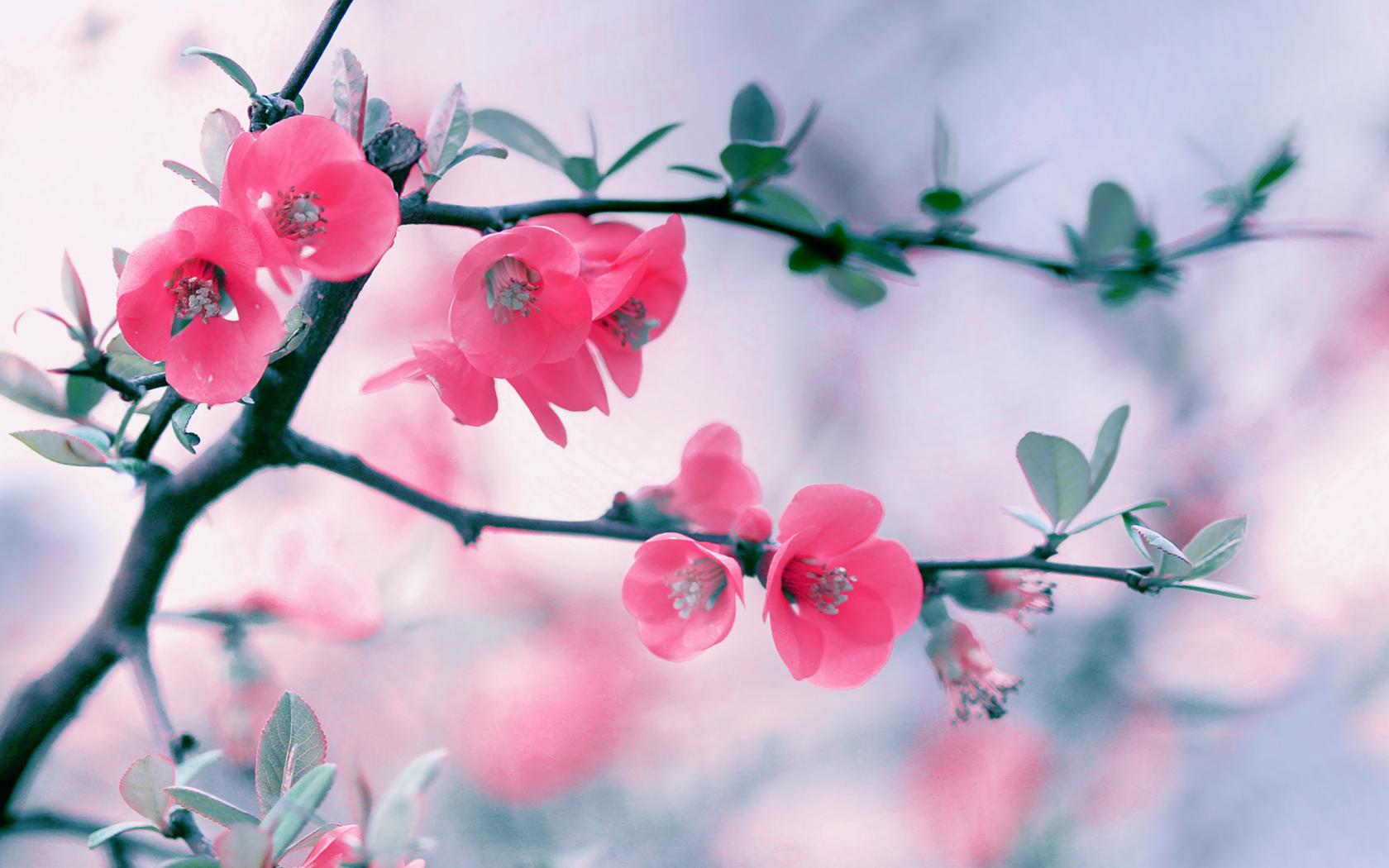 Обои Розовые нежные цветы с зелеными листьями на ветке