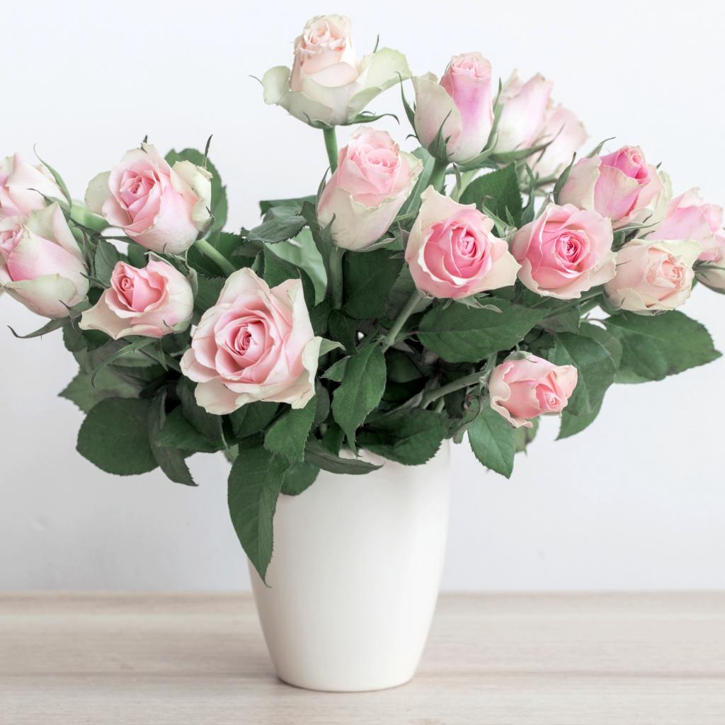 Обои Букет красивых розовых роз в белой вазе