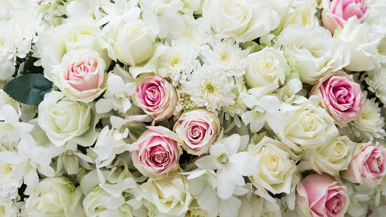 Обои Букет розовых и белых роз с цветами хризантемы