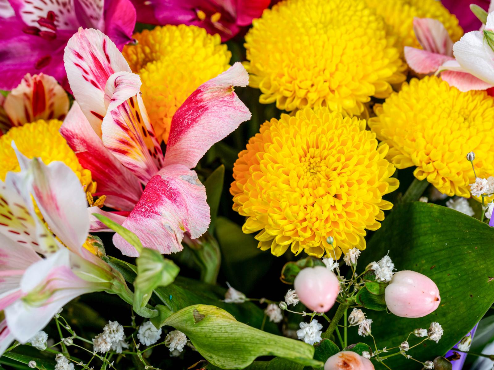 Обои Желтые хризантемы и цветы альстромерии в букете