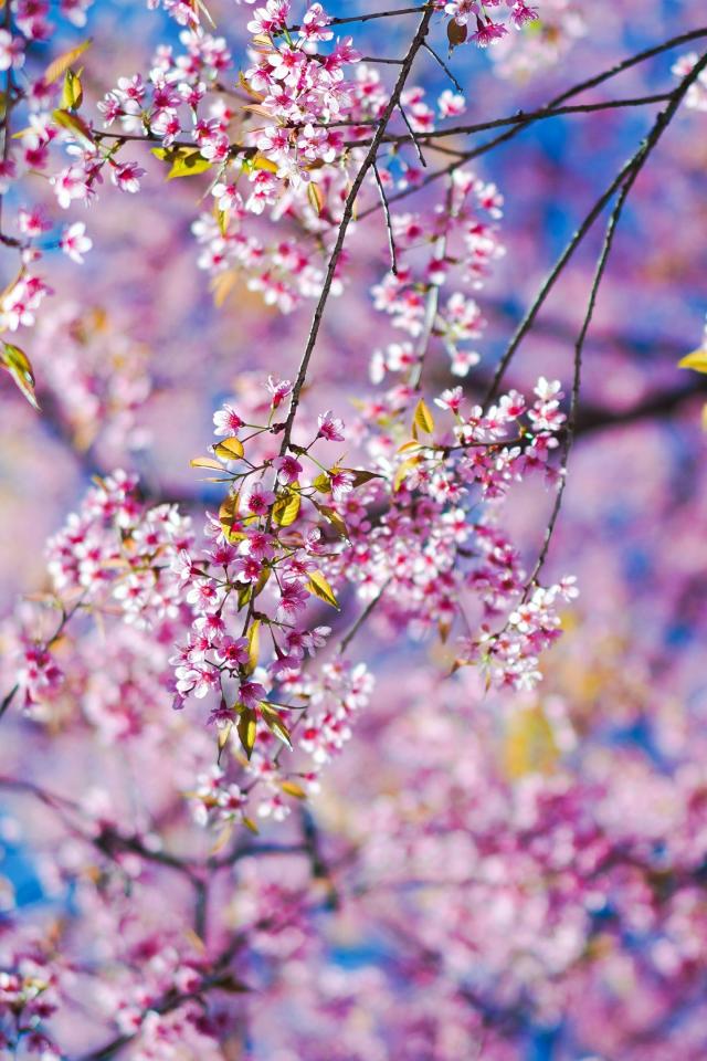 Обои Маленькие розовые цветы сакуры на ветках в лучах солнца
