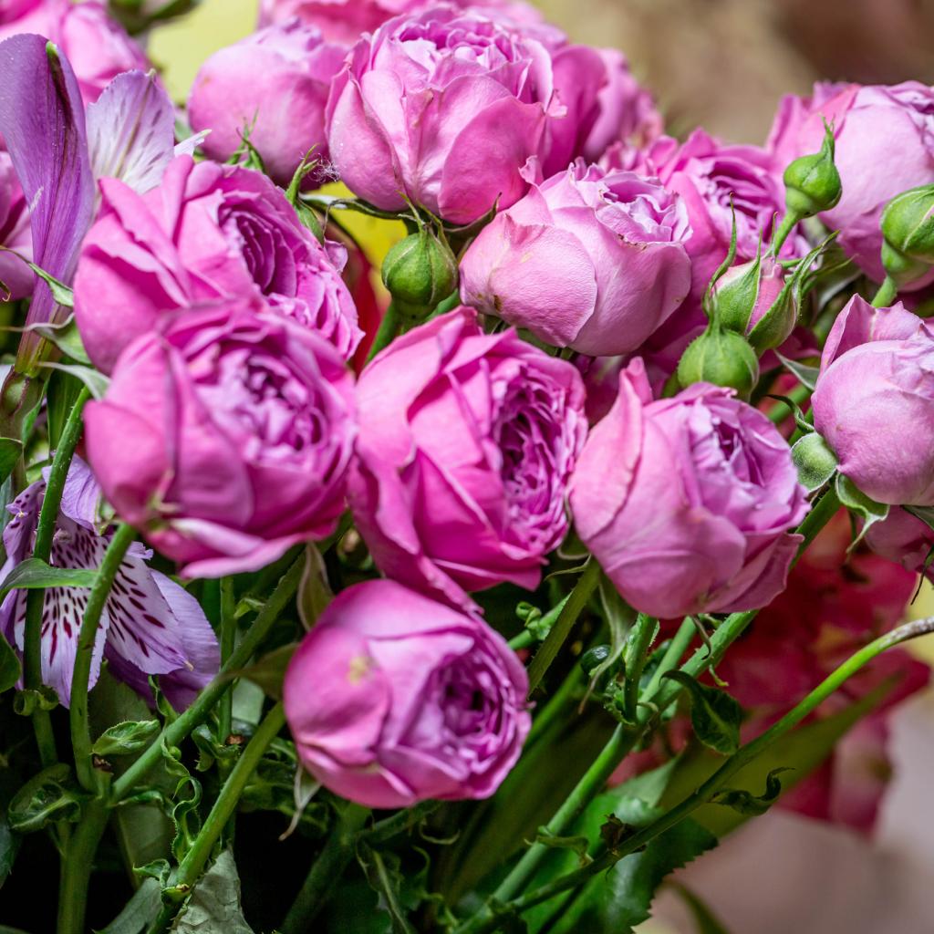 Обои Розовые розы с бутонами в букете с цветами альстромерии