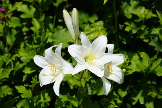 Обои Нежные белые лилии с бутонами на клумбе