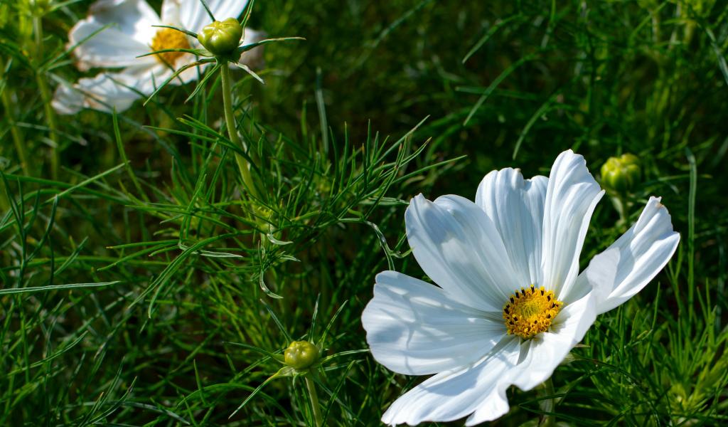 Обои Белые цветы космея с бутонами в зеленых листьях