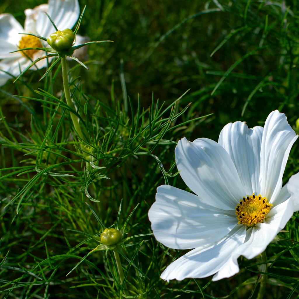 Обои Белые цветы космея с бутонами в зеленых листьях