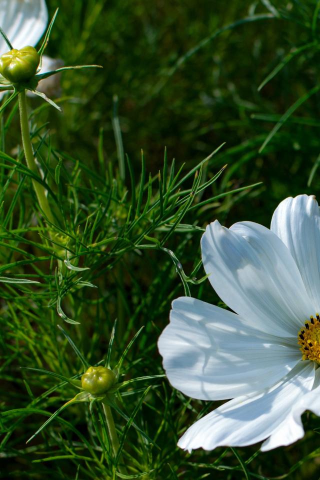 Обои Белые цветы космея с бутонами в зеленых листьях