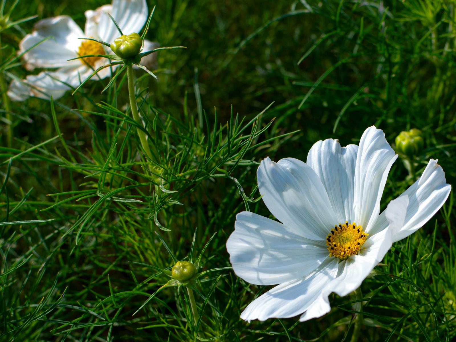 Обои Белые цветы космея с бутонами в зеленых листьях