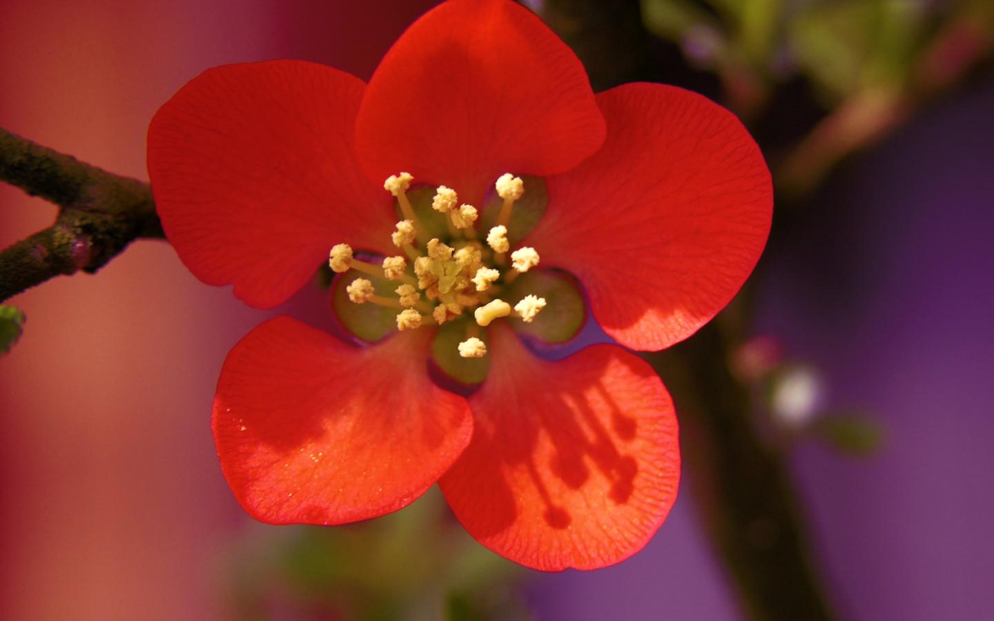 Обои Красивый маленький красный цветок на ветке крупным планом