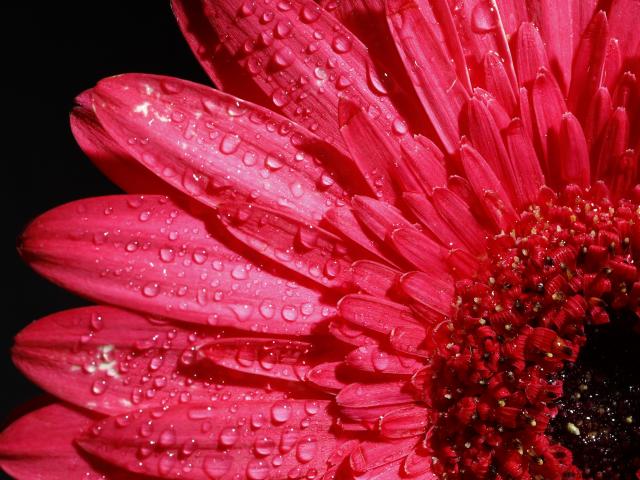 Обои Розовый цветок герберы в каплях росы на черном фоне