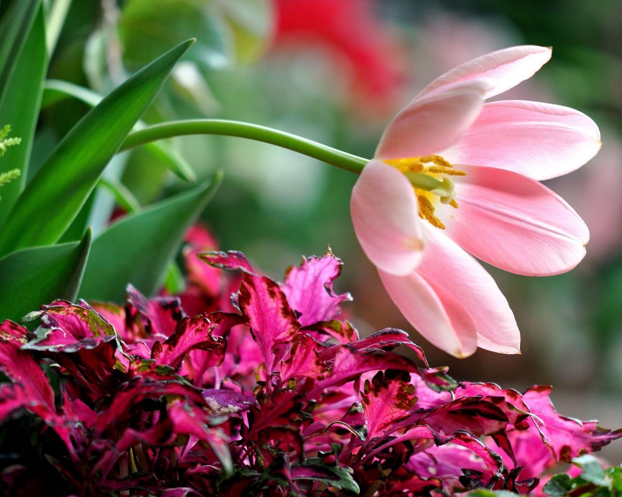 Обои Розовый тюльпан с растениями на клумбе