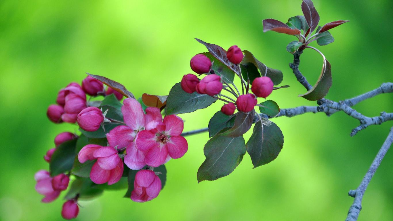 Обои Ветка с розовыми цветами яблони на зеленом фоне