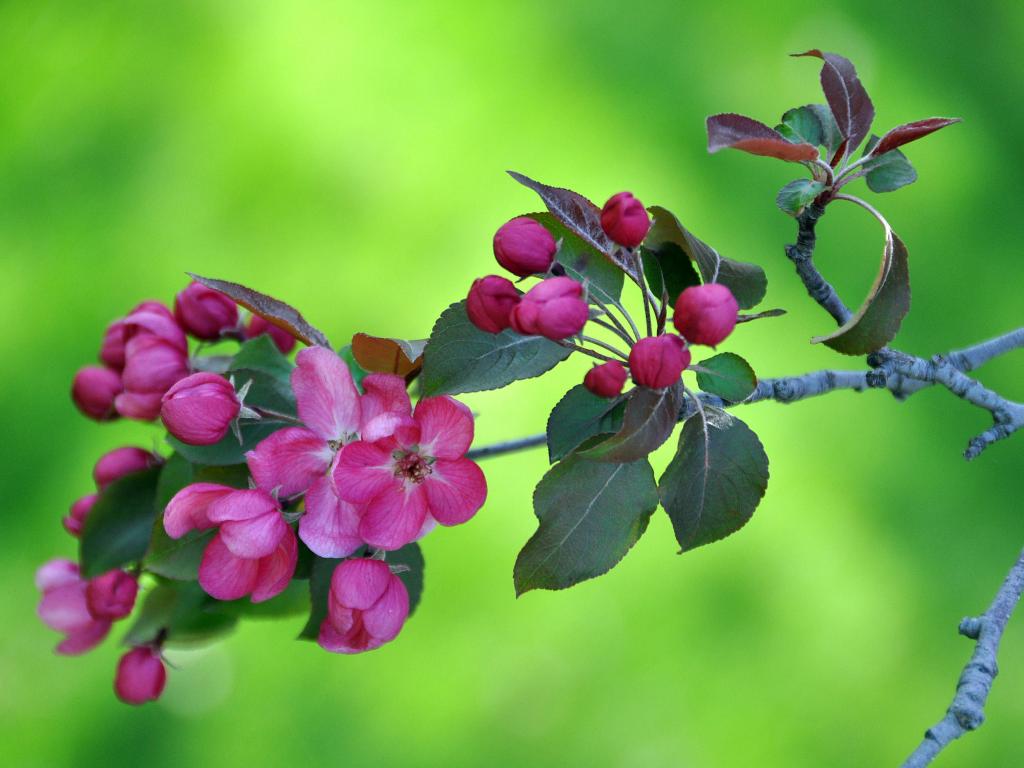 Обои Ветка с розовыми цветами яблони на зеленом фоне