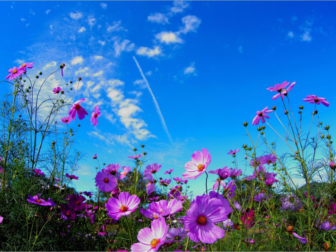 Обои Яркие розовые цветы космеи на фоне голубого неба