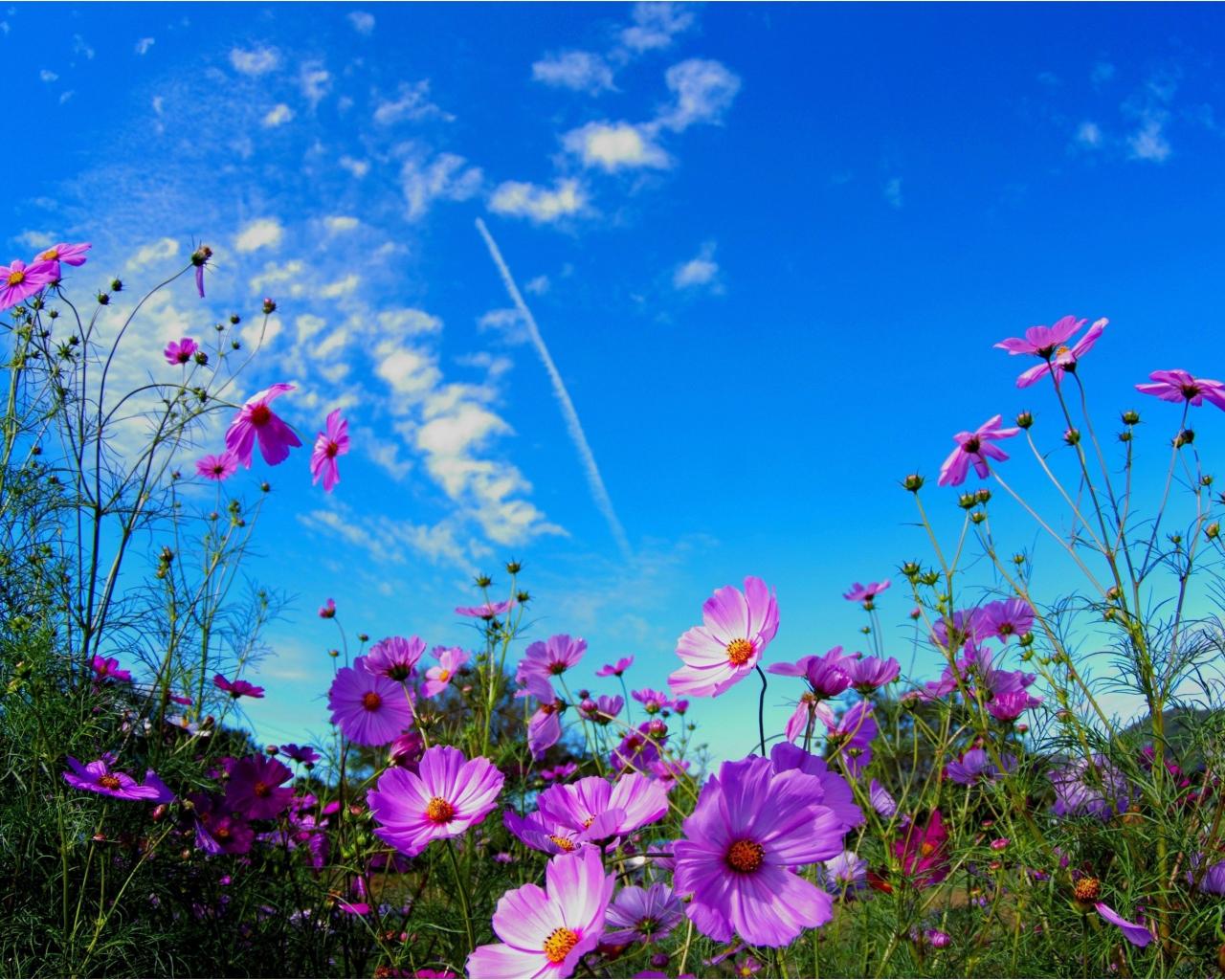 Обои Яркие розовые цветы космеи на фоне голубого неба