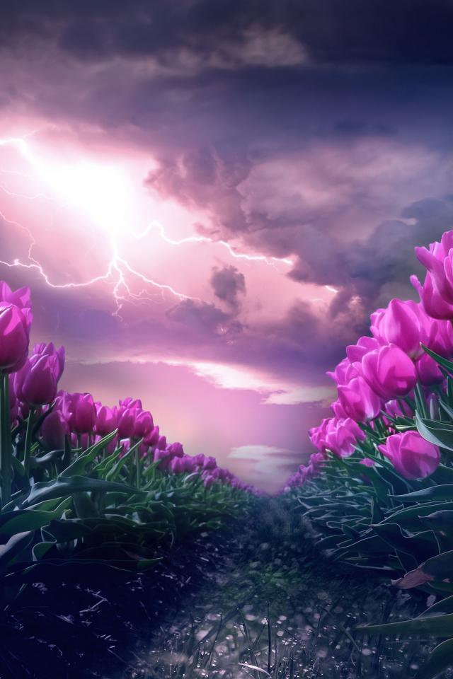 Обои Грозовое небо с молнией над полем с тюльпанами