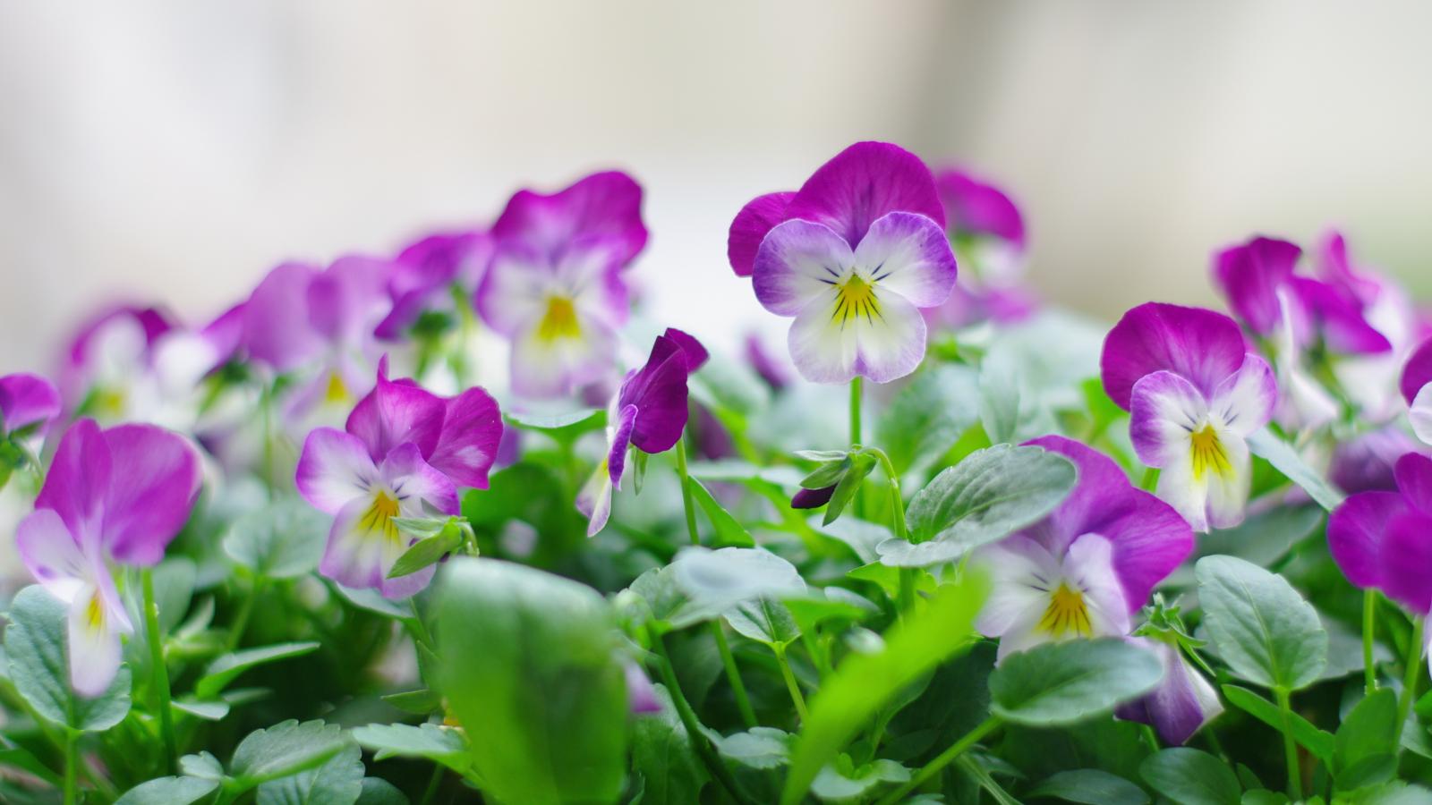 Обои Розовые цветы анютины глазки с зелеными листьями