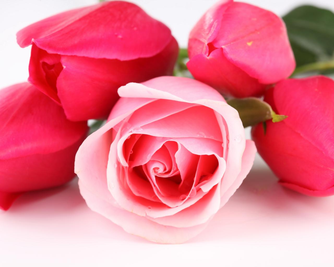 Обои Розовые тюльпаны с розой на белом фоне